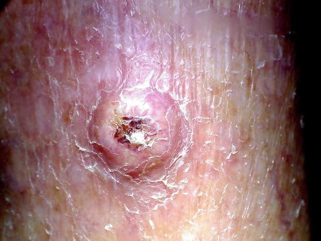 SCCs can vary in their appearance. Most SCCs usually look scaly or crusty, raised and rough as they originate from the outer layer of the skin. Underneath the scale, there may be an ulcer that bleeds easily. Where there has been a chronic skin ulcer from other causes, it may cause the ulcer not to heal. SCCs can be sore or tender and they can bleed but this is not always the case.